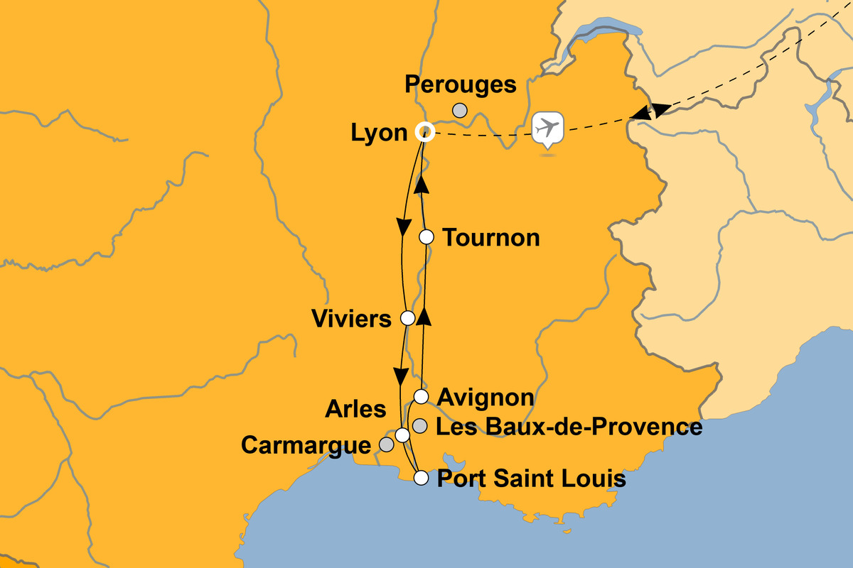 1. Tag: | Lyon | 18:00 | Anreise, Flug nach Lyon; Transfer zum Schiff; Einschiffung | |