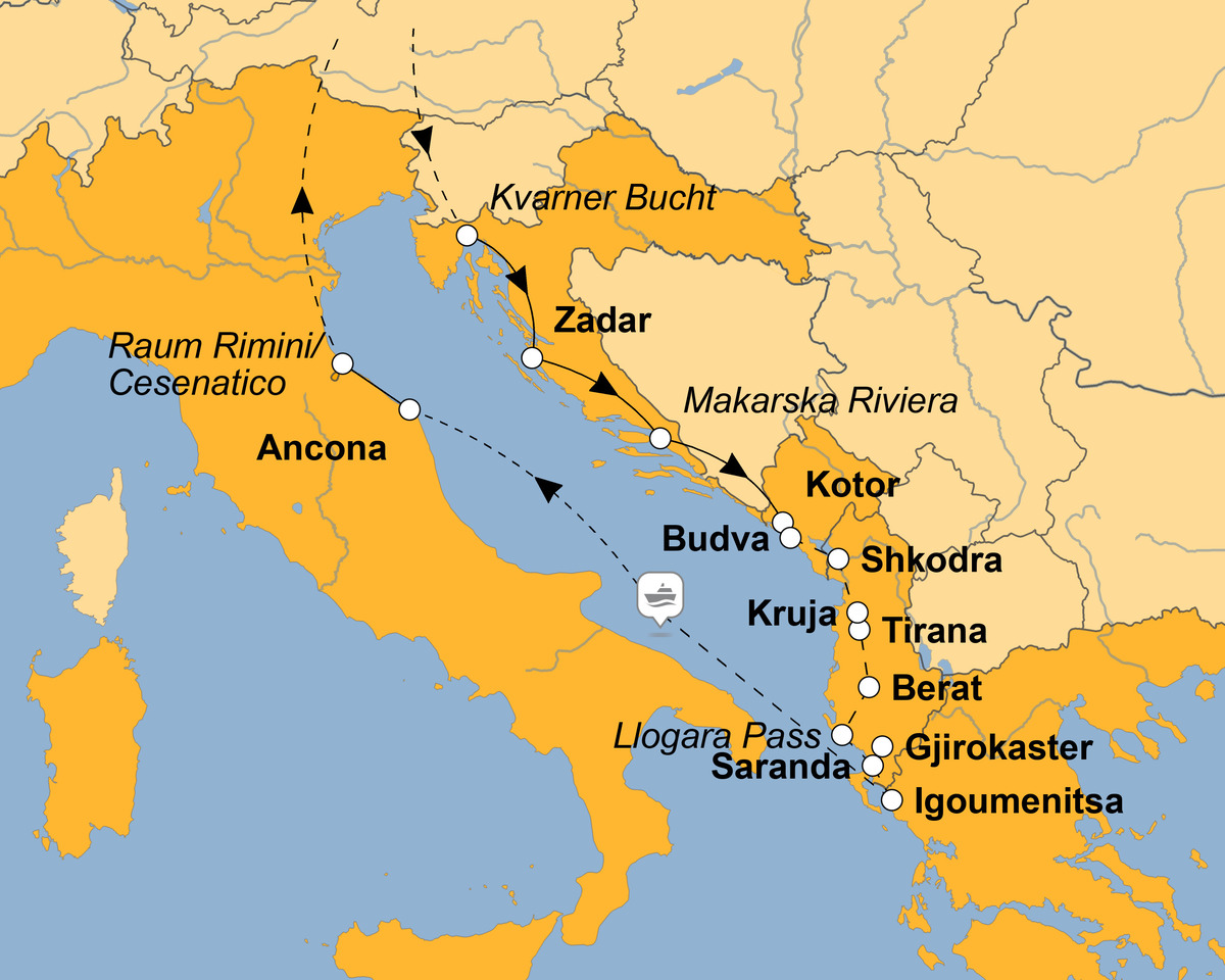 - 9 Übernachtungen in guten Mittelklassehotels im Raum Kvarner Bucht, Makarska Riviera, Budva, Tirana, Berat, Saranda, Rimini/Cesenatico und Passau/Deggendorf