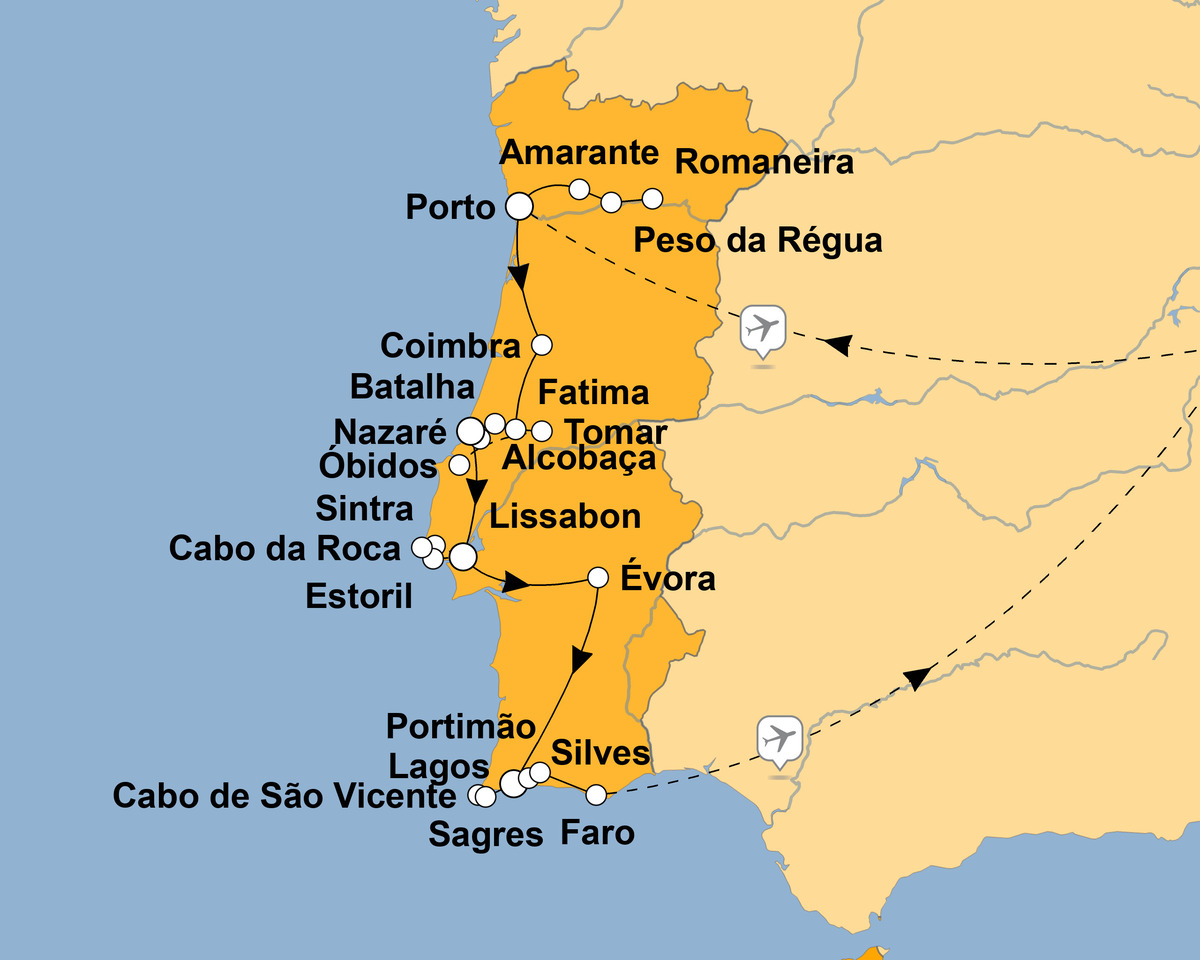 - Aufenthalte: Amarante, Coimbra, Fátima, Évora, Sagres, Portimão