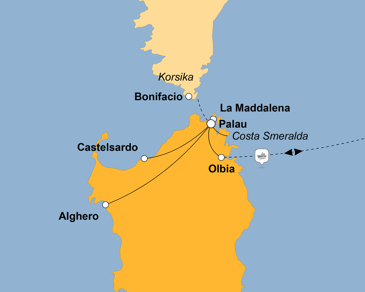 - Ausflüge: Sardiniens Dolomiten mit Costa Smeralda, Alghero mit Stadtrundgang, La-Maddalena-Archipel