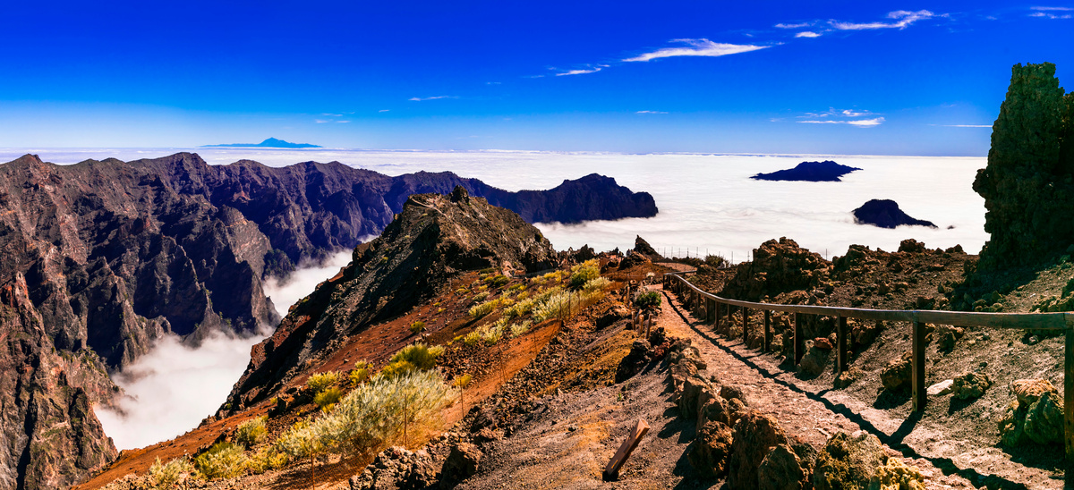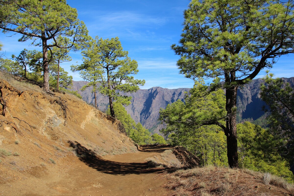 Der Weg führt uns entlang des Kraterrandes der Caldera de Taburiente, eines der größten Erosionskessel der Welt, mit über acht Kilometern Durchmesser und bis zu 2.000 Metern Tiefe. Von den Aussichtspunkten Los Andenes und Pico de la Cruz genießen wir spektakuläre Tiefblicke in die Caldera und – bei günstiger Sicht – den Anblick der Nachbarinseln Teneriffa, La Gomera und El Hierro, die wie im Atlantik schwebend erscheinen.
