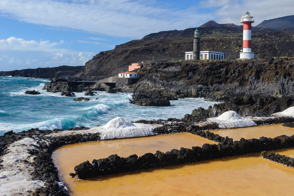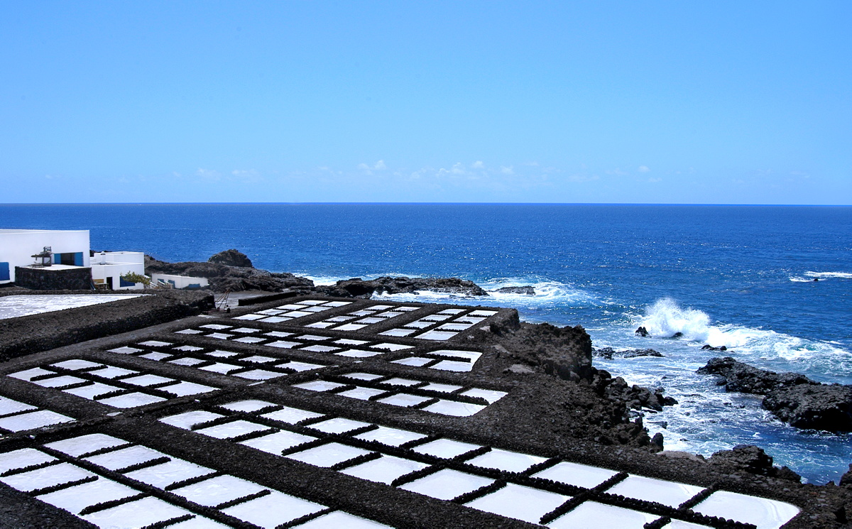 Der Abstieg führt uns vorbei an Lavafeldern bis zu den Salinen von Fuencaliente, wo das weiße Salz in glitzerndem Kontrast zur schwarzen Lava und dem blauen Meer liegt. Hier erfahren wir Wissenswertes über die traditionelle Salzgewinnung.