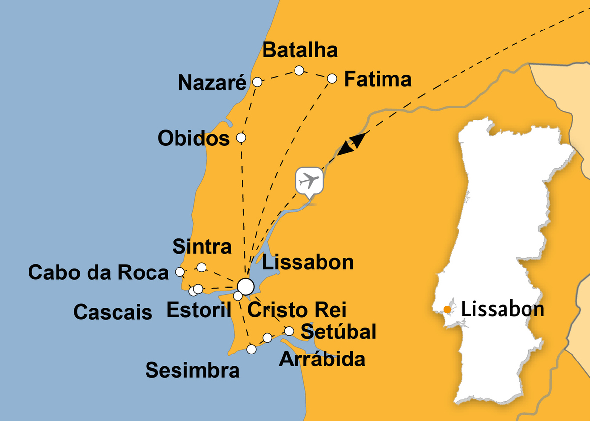 Dieser beginnt für Sie mit der Besichtigung der geheimnisvollen und einzigartigen Kleinstadt Sintra, etwa 25 Kilometer westlich von Lissabon in den Hügeln der Serra de Sintra gelegen. Bekannt nicht nur für seine vielen Denkmäler, die Natur und Strände, sondern auch für seine eigentümlichen engen Gassen, durch die sich der Besucher in längst vergangene Zeiten versetzt fühlt. Die Stadt steht ebenso für ihre enge Verbindung zur Monarchie, da sie über Jahrhunderte hinweg als Sommerresidenz der portugiesischen Könige diente, wovon Sie sich beim Besuch des Stadtpalastes Palácio da Vila überzeugen können.