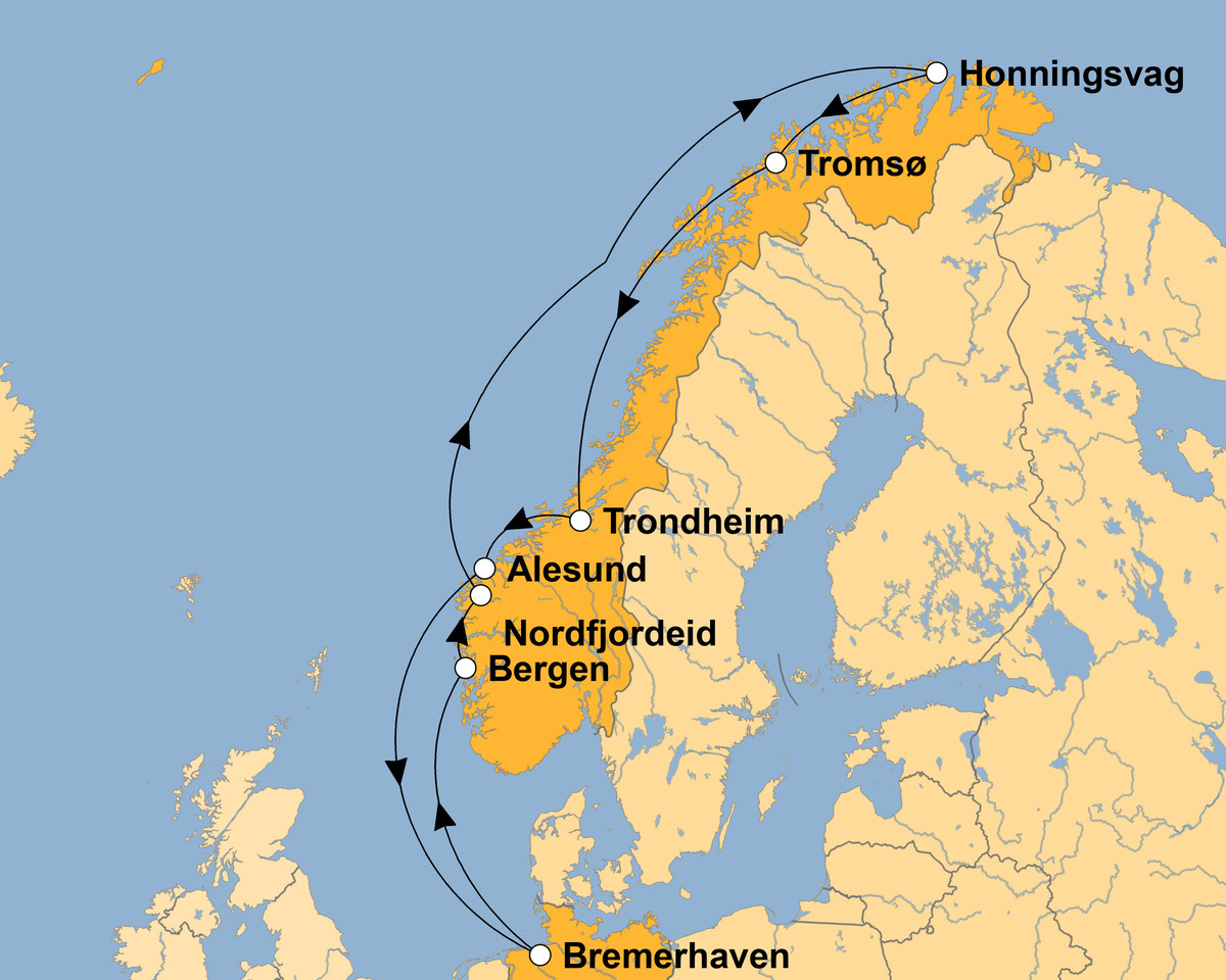 Bremerhaven-Bergen-Eidsfjord-Nordkap-Tromso-Trondheimfjord-Alesund-Bremerhaven