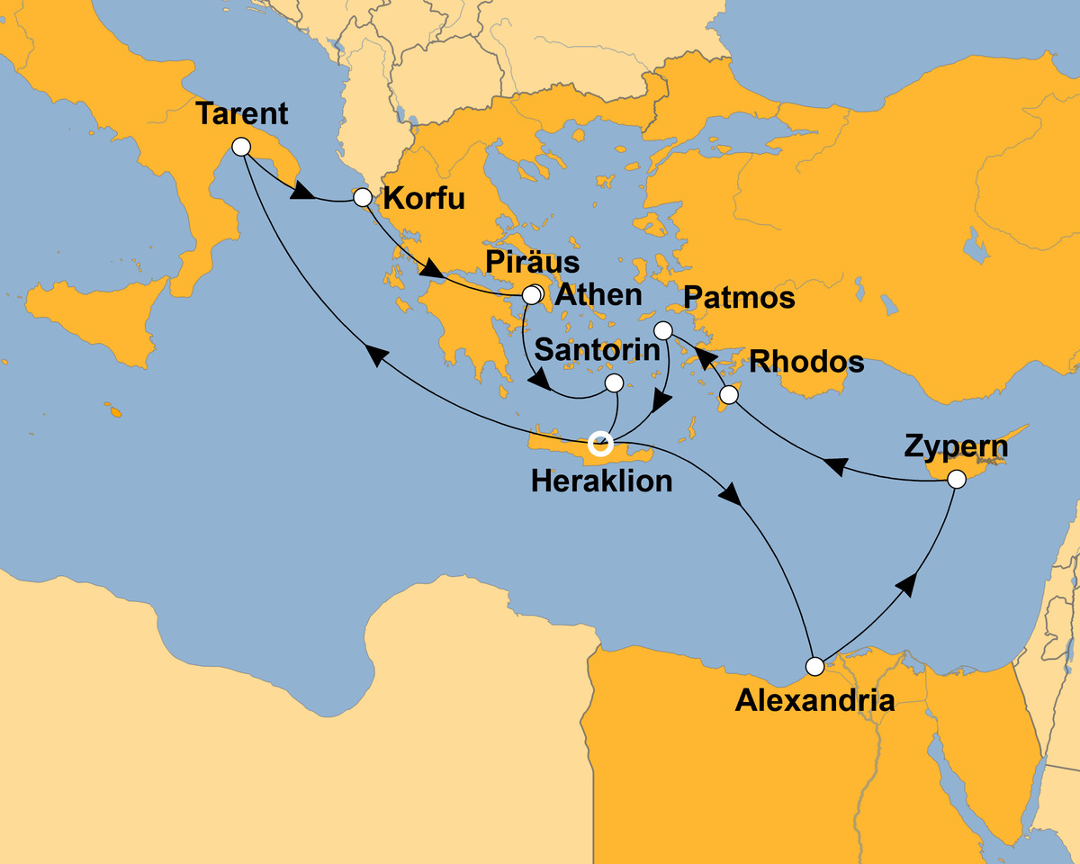 1. Tag: | Heraklion/ Griechenland | 22:00 | Anreise; Flug und Einschiffung | |