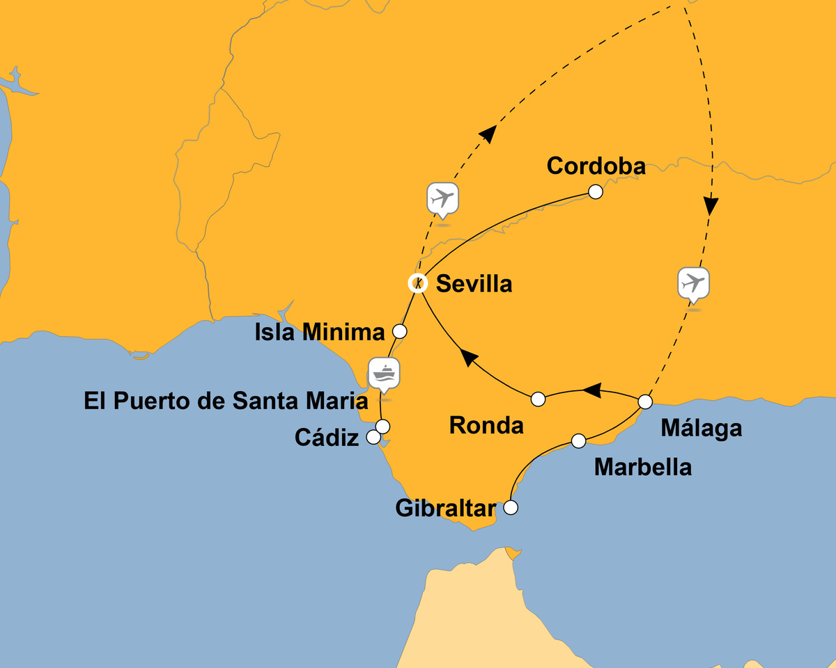 Mit Sevilla, Córdoba, Cádiz und Jerez de la Frontera steuert Ihr Kapitän nicht nur die schönsten Städte in Spaniens Süden an, in denen die Geschichte einen faszinierenden Mix aus maurischer und spanischer Kultur geschaffen hat. Immer wieder gehen Sie auch von Bord und genießen - neben Stadtrundgängen durch jahrtausendealte Mauern, Paläste, Klöster - kulinarische und kulturelle Highlights der Region. In Jerez de la Frontera wachsen die besten Sherrys. In El Puerto de Santa Maria kosten Sie den für die Region charakteristischen Manzanillas-Wein und die melancholische Leidenschaft der Andalusier kommt bei einem exklusiven Flamencoabend an Bord Ihres komfortablen Hotelschiffs zur Aufführung. Olé!