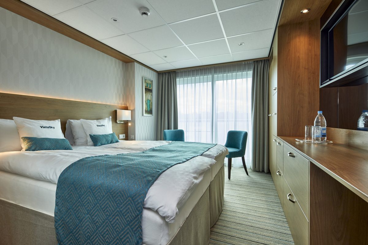 Alle Kabinen sind Außenkabinen und auf dem Mittel- und Oberdeck (ca. 14,5 m²) mit bodentiefen Panoramafenstern zum Öffnen (franz. Balkonen) ausgestattet. Die kleineren Fenster der Hauptdeck- kabinen (ca. 13 m² ) können nicht geöffnet werden. Alle Kabinen sind modern und geschmackvoll mit hochwertiger Ausstattung eingerichtet: DU/WC mit Schiebetür, Föhn, Doppelbett, Sat-TV, Telefon, individuell regulierbare Klimaanlage/Heizung, Safe, Minibar, 2 kleine Sessel mit Tischchen, auf dem Hauptdeck eine Schreibecke mit kleinem Sessel. Eine Kaffeemaschine kann auf Wunsch an der Rezeption ausgeliehen werden. Kabinen mit VIP-Service erhalten zur Begrüßung einen Obstteller, eine Flasche Sekt und einen Gutschein für das schiffseigene Steakhouse „VistaGrill“ (ab 7 Übernachtungen). Die 3-Bett-Kabine verfügt über zwei untere Betten und ein unteres Klappbett. In begrenzter Anzahl können 2-Bett-Kabinen zur Alleinnutzung gegen Aufschla gebucht werden.