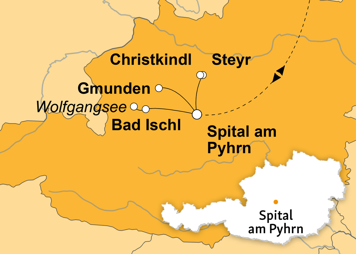 - Ausflüge: Steyr und Christkindl, Bad Ischl, Wolfgangsee, Gmunden