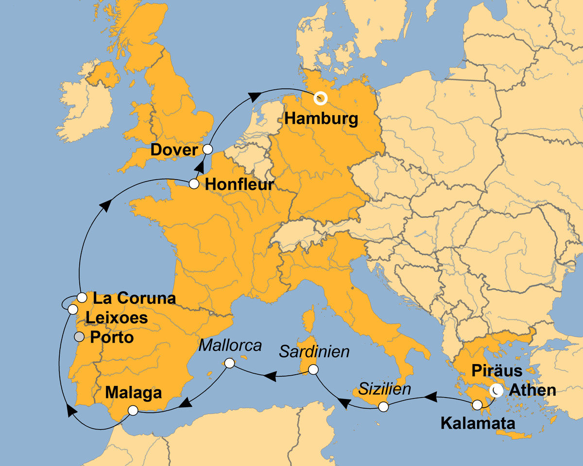 Wie facettenreich Europa sein kann, erleben Sie auf dieser einzigartigen Kreuzfahrt von Piräus nach Hamburg. Nach dem Besuch der griechischen Hauptstadt Athen gehen Sie in Piräus an Bord. Via Kalamata erreichen Sie schon bald mit Sizilien und Sardinien zwei der schönsten italienischen Inseln. Bei Landgängen auf Mallorca und in Málaga haben Sie die Möglichkeit mit Sóller und der Alhambra von Granada beeindruckende UNESCO-Weltkulturerbe zu entdecken. In Porto werden Sie bunte Häuser und Portwein ebenso begeistern, wie in Santiago de Compostela die majestätische Kathedrale, nicht nur das Traumziel zahlreicher Pilger. Bevor die Reise in Hamburg mit einer eindrucksvollen Hafeneinfahrt zu Ende geht, steht noch das malerische Fischerdorf Honfleur und ein Ausflug nach London, aufregend und vielfältig zugleich, auf dem Besuchsprogramm.