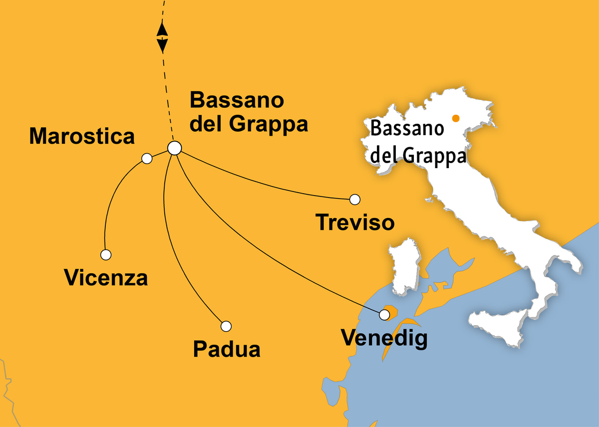 Zurück in Bassano del Grappa unternehmen Sie einen Rundgang durch die historische Altstadt mit der hölzernen Brücke Ponte Vecchio aus dem 13. Jahrhundert, bevor eine Grappa-Verkostung für einen wärmenden Genuss sorgt. Anders als der Name es vermuten lässt, bezieht sich die Namensgebung von Bassno del Grappa zwar nicht auf den bekannten italienischen Schnaps, sondern auf den nahegelegenen Berg Monte Grappa. Nichtsdestotrotz begann Italiens ältester Grappa-Hersteller 1779 hier mit seiner Produktion.